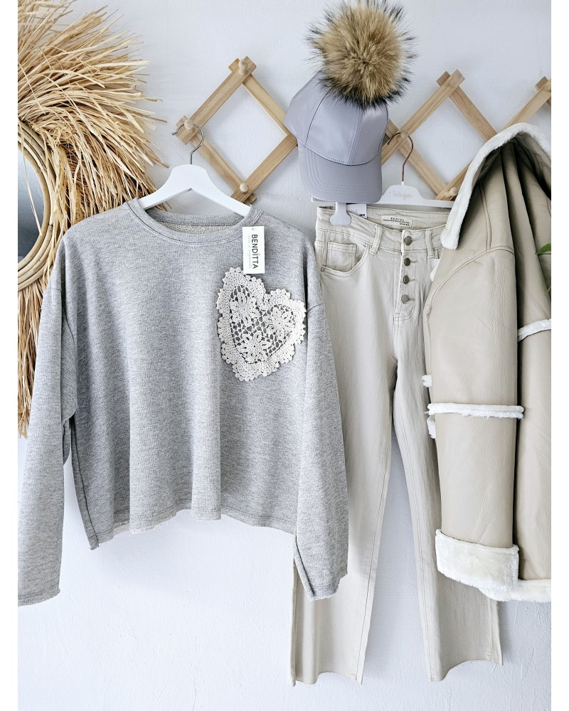 Original y bonita Sudadera fina en color gris medio con discreto hilo metalizado en plata. Detalle de Corazón de Crochet en color beige en parte delantera. Mangas amplias y cuello redondo. Bajo semidesflecado.
