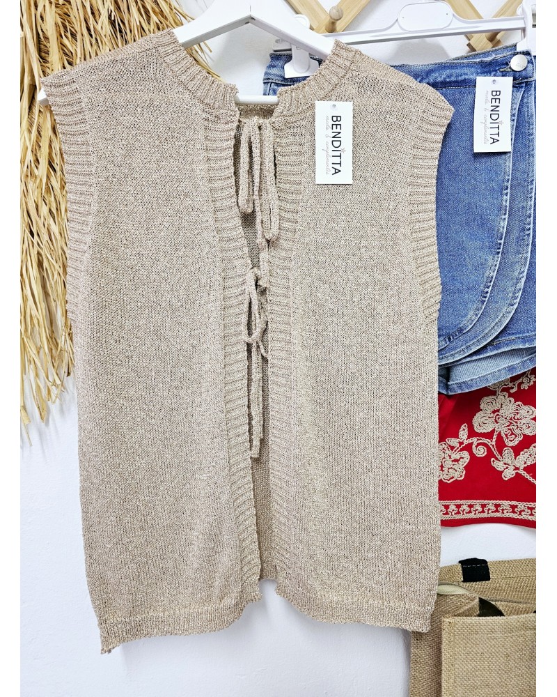 Monísimo Jersey sin mangas en hilo metalizado en color dorado. Cuello redondo. Parte trasera con lazadas.
