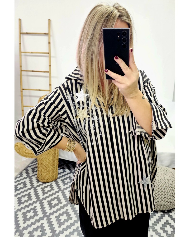 Ideal Camisa oversize o Sobrecamisa con estampado mil raya en negro / beige y detalle de Estrellas en strass dorado y plateado. Botonadura delantera para su cierre. Más larguitas por detrás.