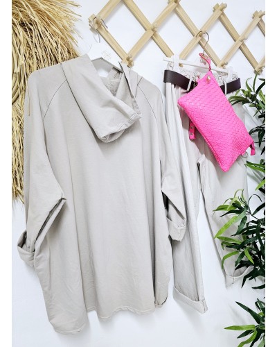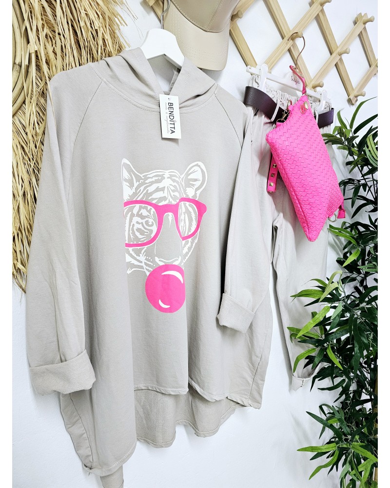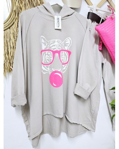 Brutal Sudadera Oversize en color topo. Con dibujo impreso en parte delantera de tigre en blanco y rosa flúor. Con capucha. más larguitas por detrás.