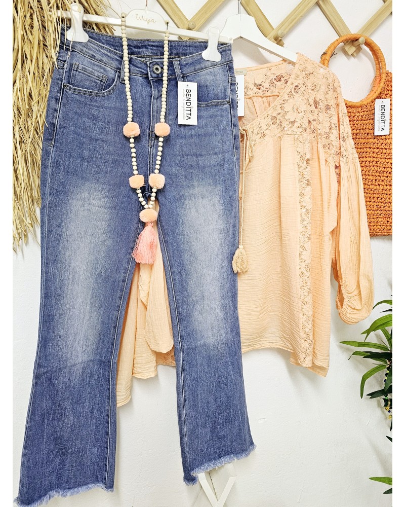 Ideales Pantalones Vaqueros en color azul medio. Elásticos. Son largo crop, por el tobillo más o menos y acaban en un poquito de campana. Con bolsillos delanteros y traseros. Tiro medio.