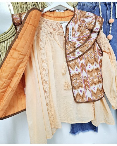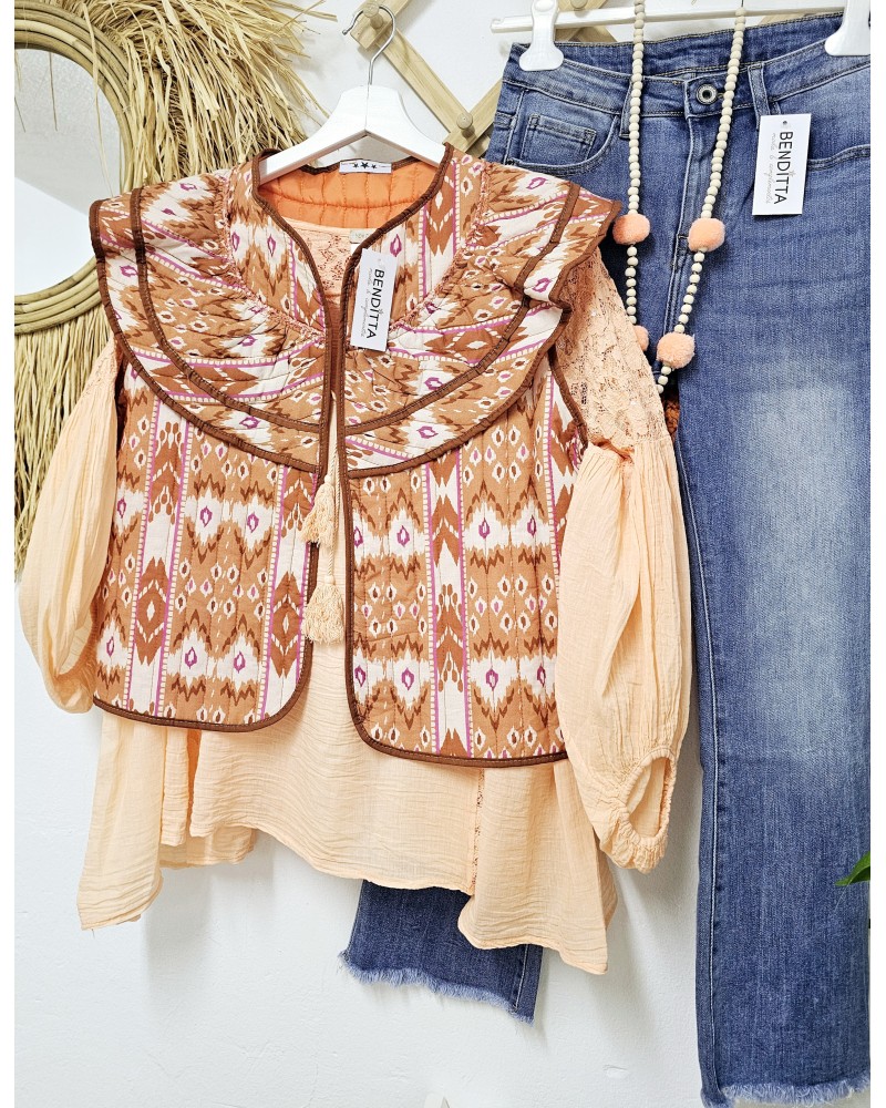 Chaleco un poquito acolchado con estampado étnico en tonos naranjas, tostado, morado...Con detalle de volante ribeteado en parte superior.