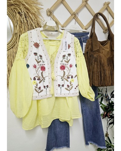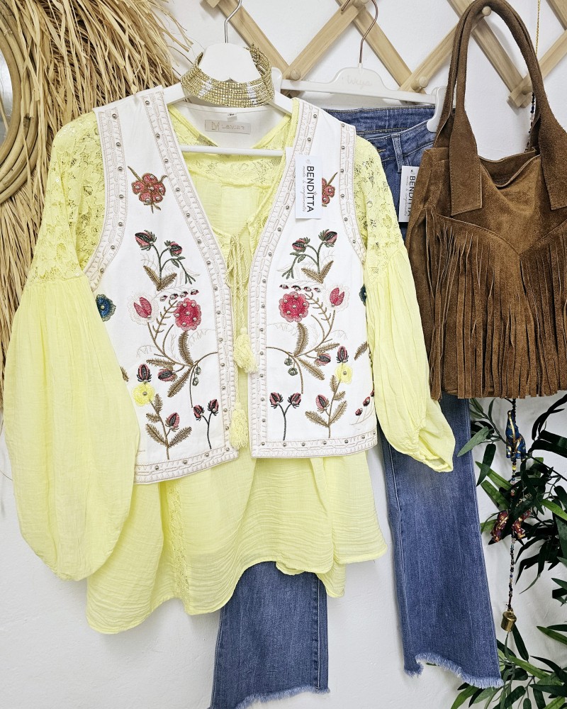 Chaleco tejido denim en color blanco. Con flores bordadas en varios colores y tachas metálicas. No se cierran.