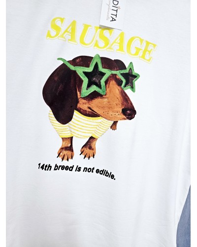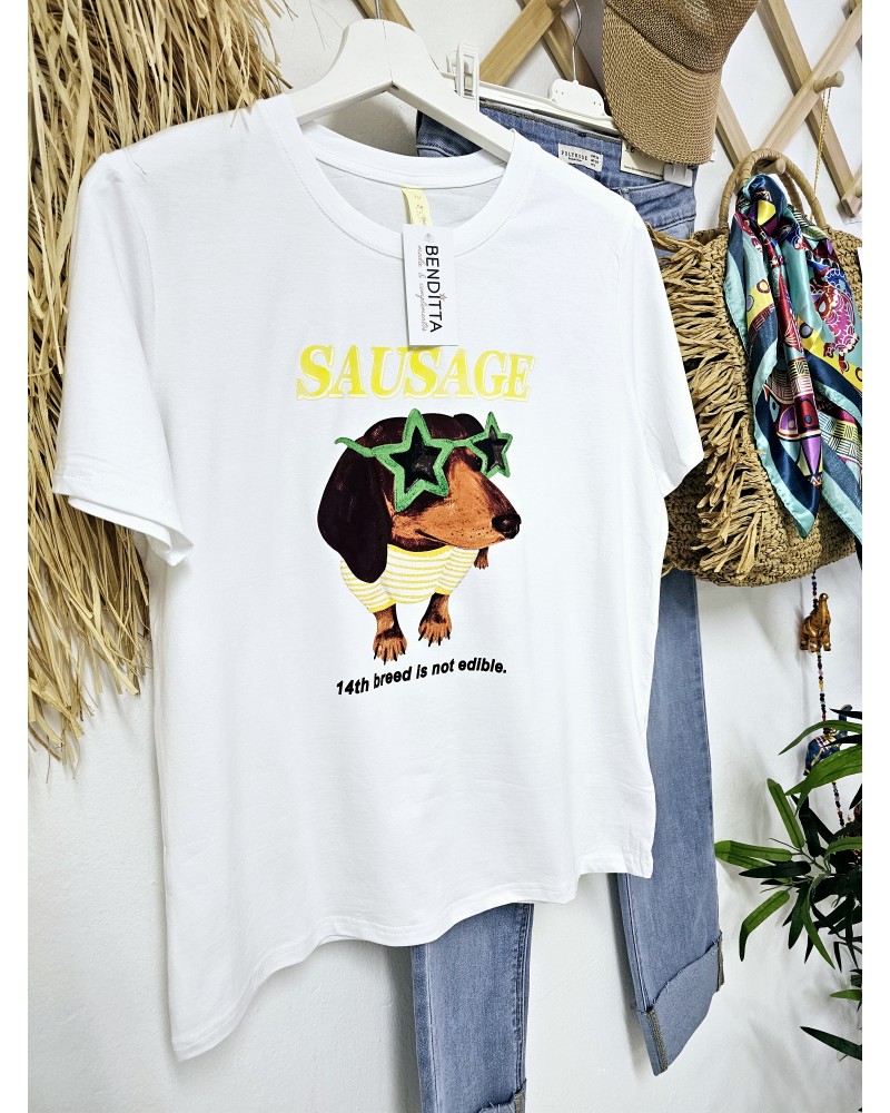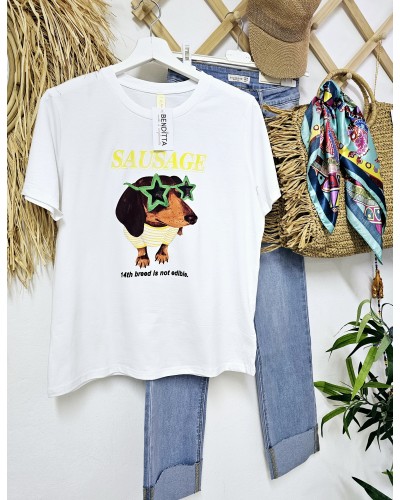 Camiseta de algodón en color blanco con detalle de dibujo y texto impreso en parte delantera de teckel con gafas con forma de estrellas y detalles en amarillo y verde.