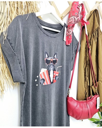 Vestido largo en color carbón desgastado con cuello redondo, manga corta remangada y detalle impreso de dibujo en parte delantera de perro, palomitas y detalles.