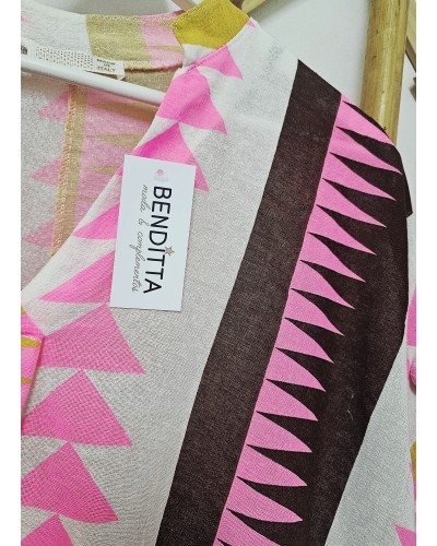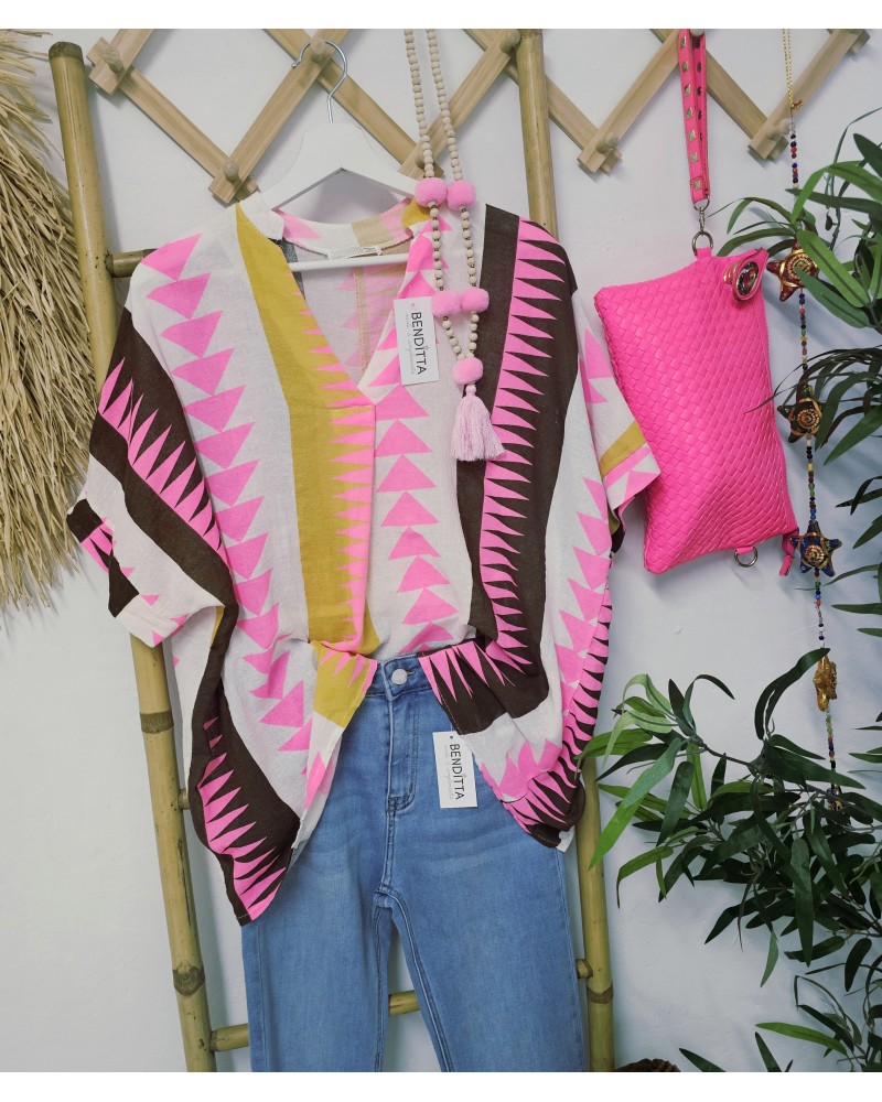 Camisa de algodón con acabado tipo lino. Media manga amplia, escote pico y goma elástica en cintura. Son muy fresquitas y holgadas. Estampado étnico en tonos rosa flúor, marrón, ocre..