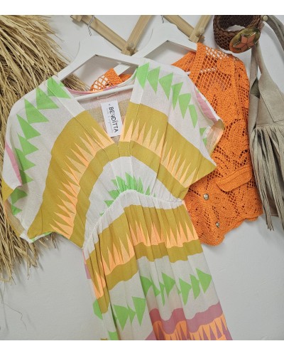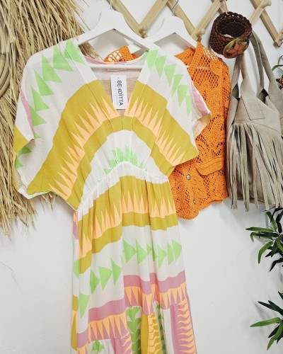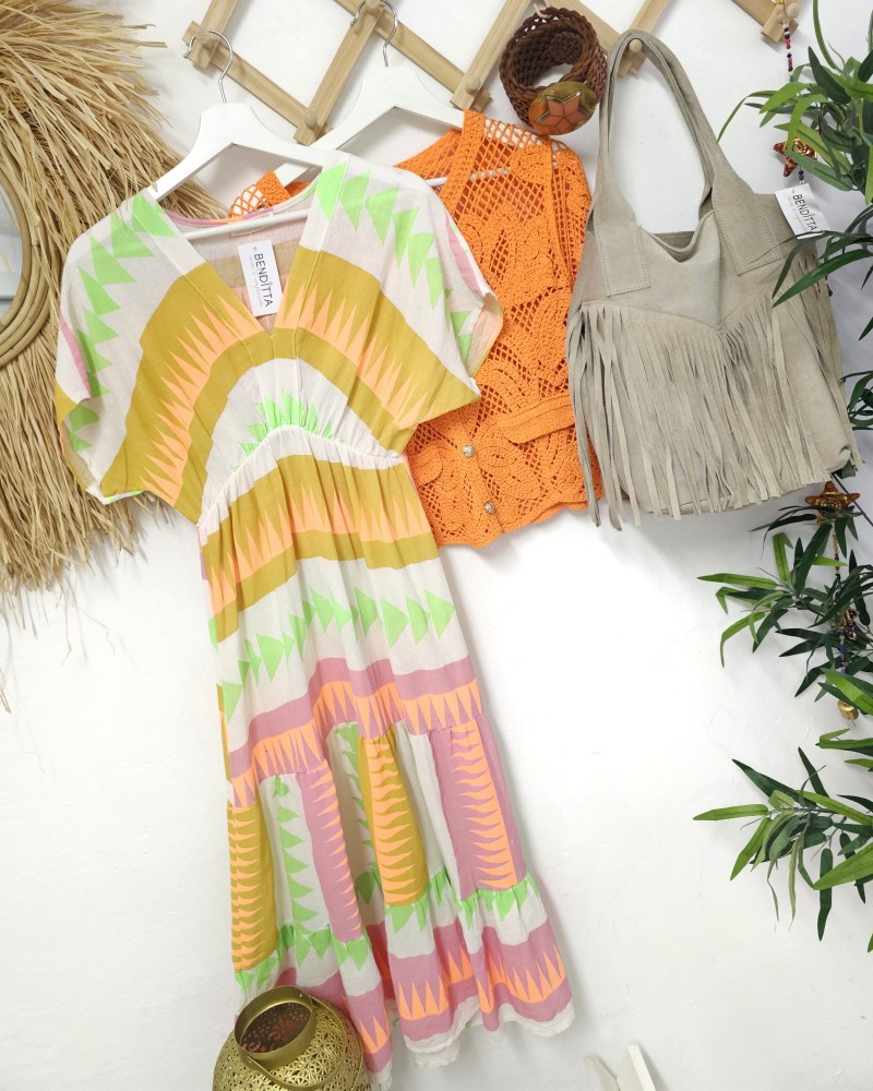 Vestido largo de algodón con acabado tipo lino. Media manga amplia, escote pico y goma elástica en cintura. Son muy fresquitos y cómodos. Estampado étnico en tonos rosa, naranja flúor, verde, ocre..