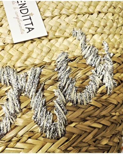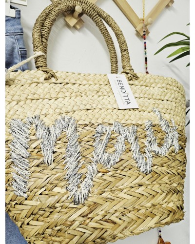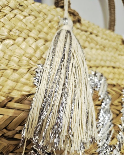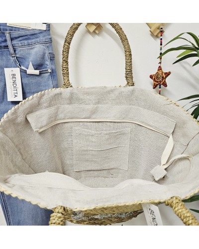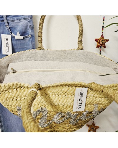 Capazo tamaño grande de mimbre natural bicolor. Con texto y borla de adorno hecho con hilo beige y plateado. Con cremallera para su cierre, bolsillo y forrado completamente en su interior.