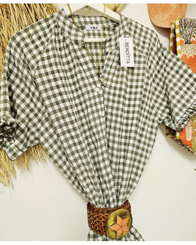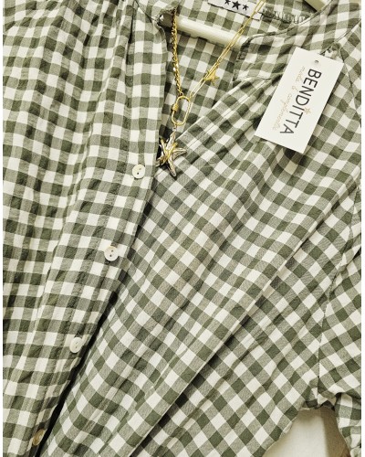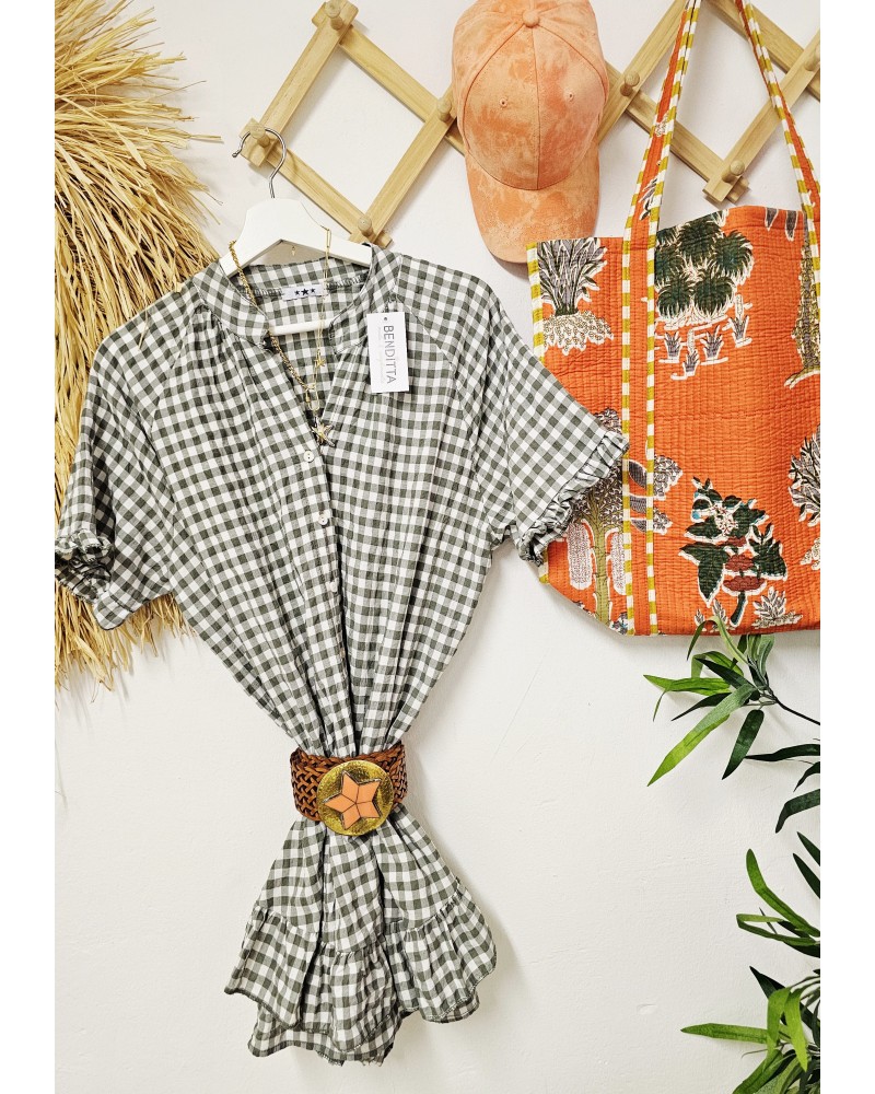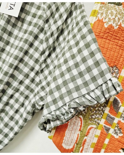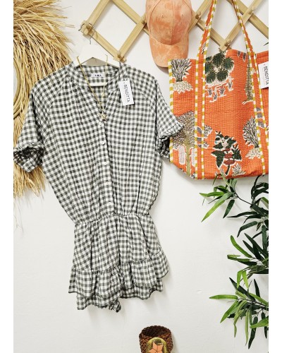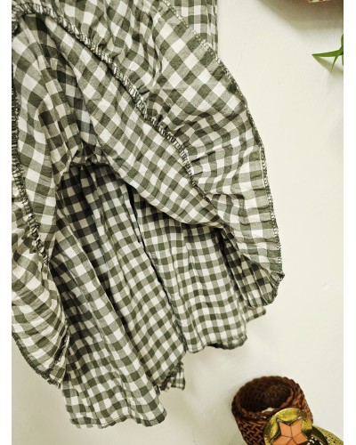 Mono efecto falda corta con estampado vichy en verde caqui y blanco. Media manga y bajo acabados en volante. De meter por la cabeza, con botones en parte superior. Goma elástica en cintura.