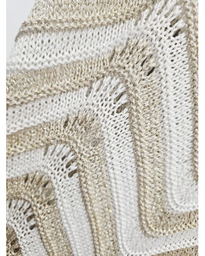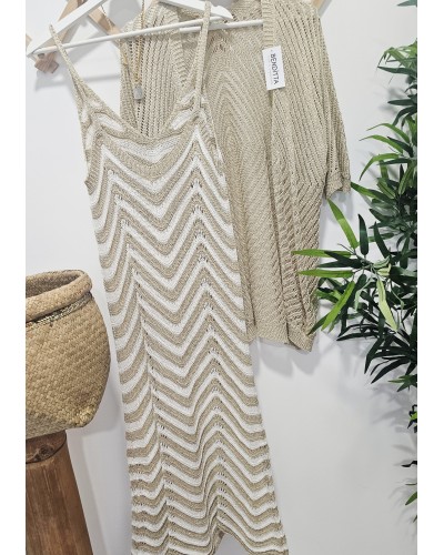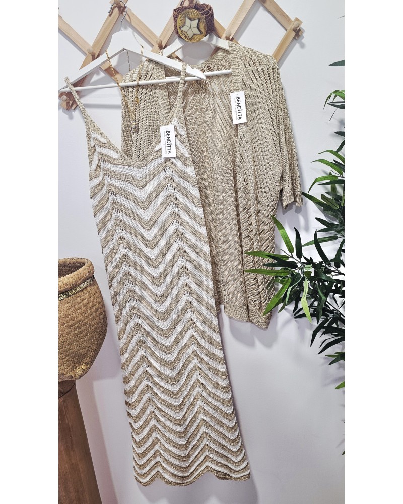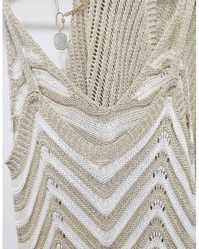 Vestido largo tobillero de punto en color dorado y blanco. Tirante fino, escote en espalda.