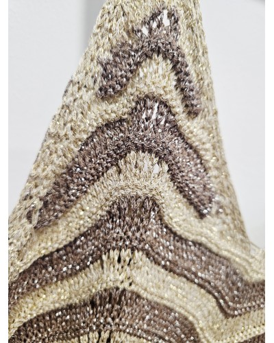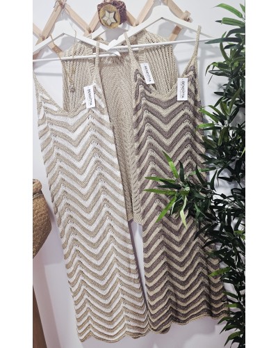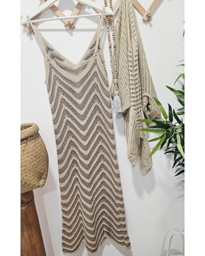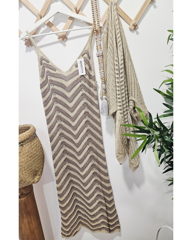 Vestido largo tobillero de punto en color dorado y marrón suave. Tirante fino, escote en espalda.
