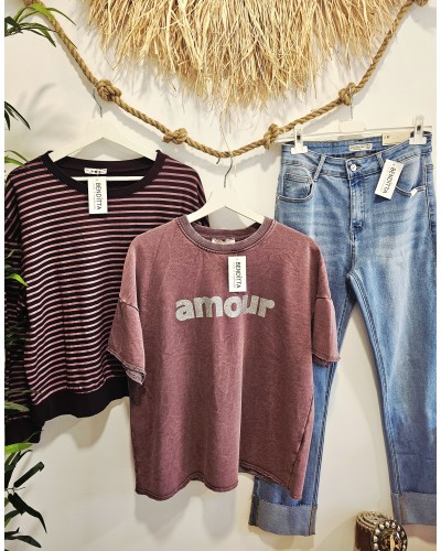 Sudadera con corte de camiseta, efecto lavado en color burdeos. Cuello redondo y manga corta acabadas sin costuras. Detalle de texto en color plata brillo en parte delantera.