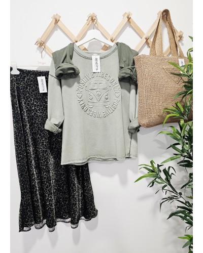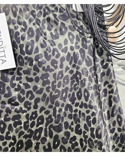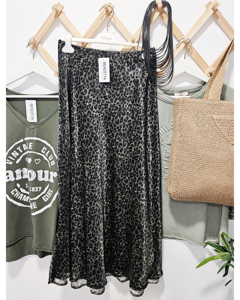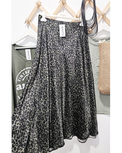 Falda Larga con pequeño estampado de leopardo en negro y fondo en verde caqui. Satinada, tipo raso. Con goma elástica en la cintura.