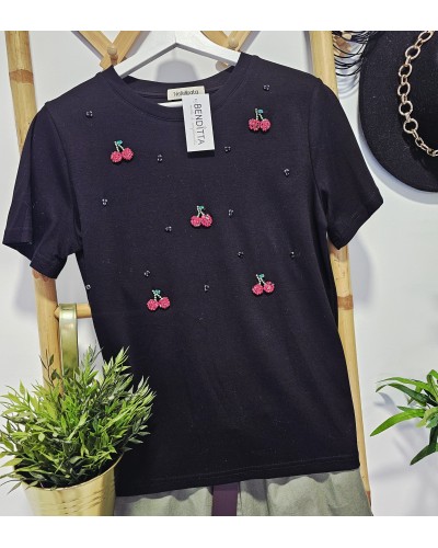 Camiseta en color negro con detalle frontal de cerezas en piedras de colores rojo, verde y negro. Cuello redondo. Manga corta.