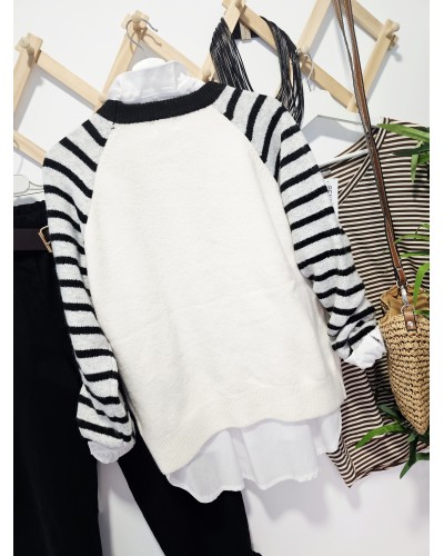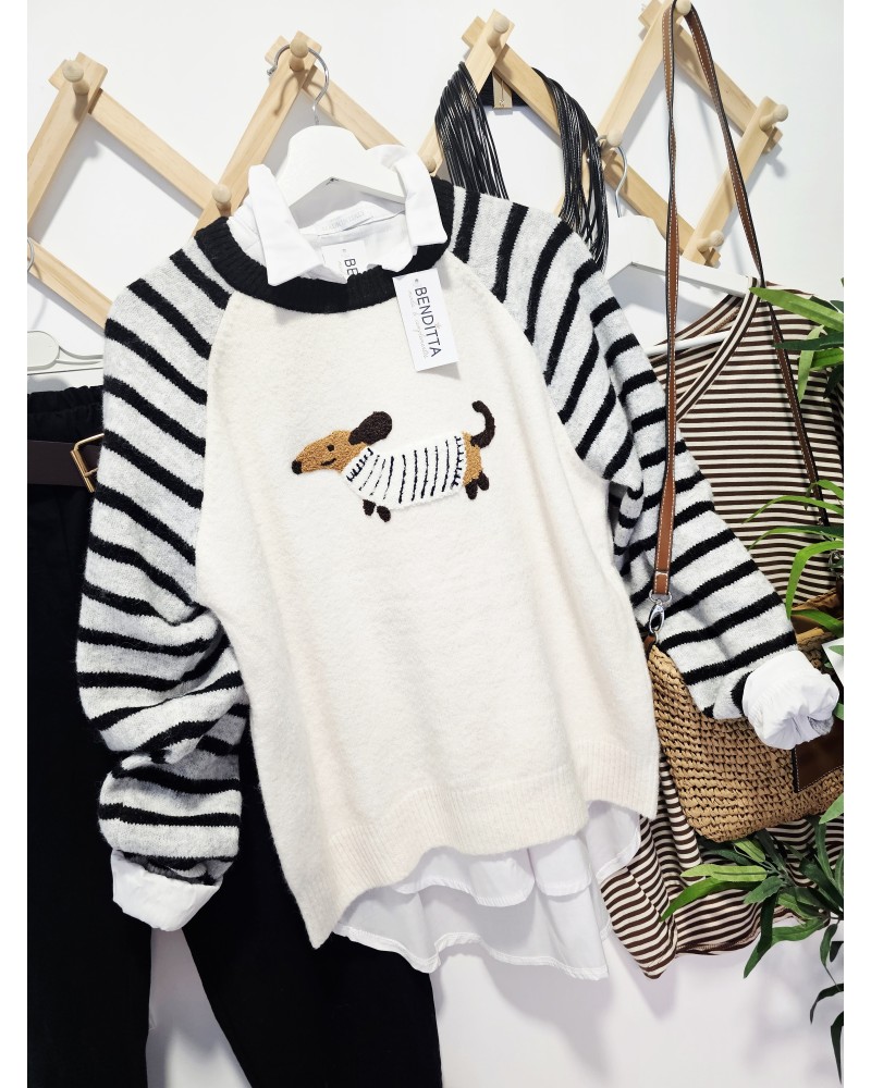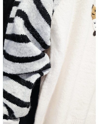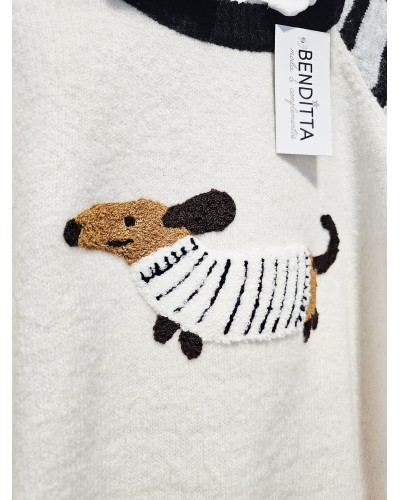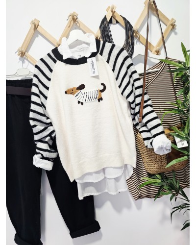 Jersey suave en color hueso combinado con mangas de rayas en gris y negro. Detalle de teckel en relieve en parte delantera en tonos camel, hueso, negro...cuello redondo.