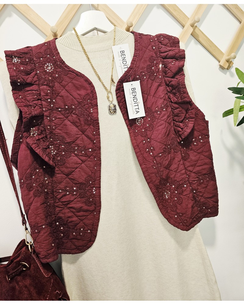 Chaleco de tejido acolchado finito en color burdeos. No se atan. Con detalle de volantes. Bordado de dibujos en el mismo tono y pequeñas lentejuelas plata.