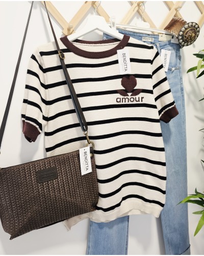Bolso / Bandolera tipo sobre de piel trenzada en color marrón chocolate. Con cremallera y bolsillo interior. Asa larga regulable.