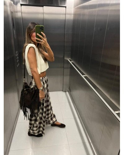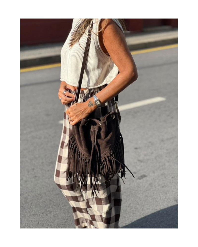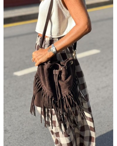 Bolso / Bandolera de ante en color marrón chocolate. Con asa larga regulable. Detalle de flecos en el mismo tono.