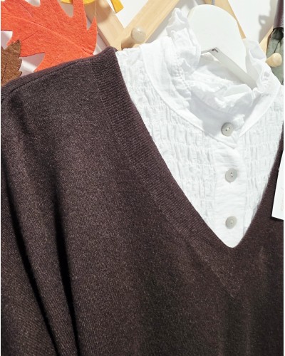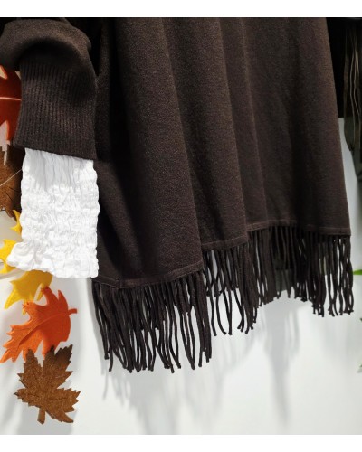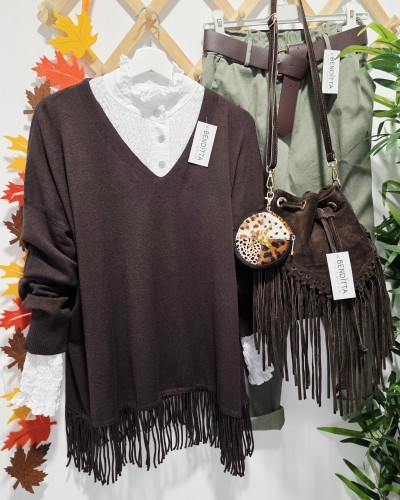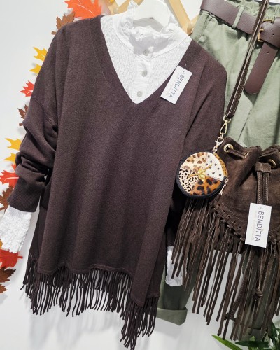 Jersey de punto fino en color marrón chocolate. Cuello pico. Manga larga. Bajo acabado en flecos del mismo color.