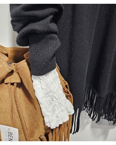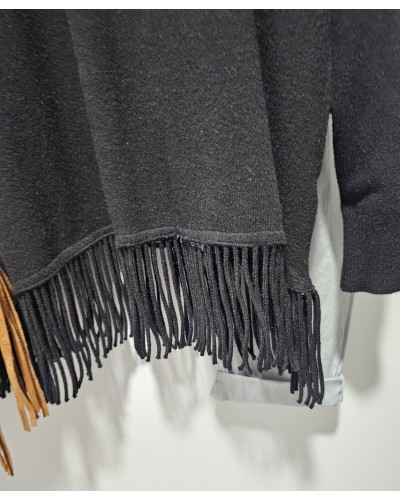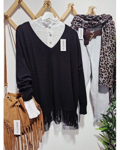 Jersey de punto fino en color negro. Cuello pico. Manga larga. Bajo acabado en flecos del mismo color.