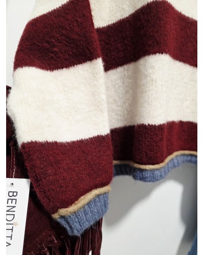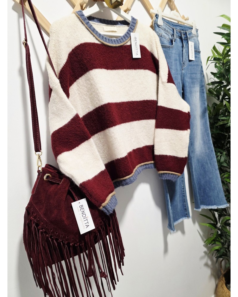 Jersey suave de punto grueso. Con estampado de rayas en color borgoña y fondo en crudo. Bordes de cuello, bajo y puños en color camel y azul medio. Cuello redondo. son anchitos.