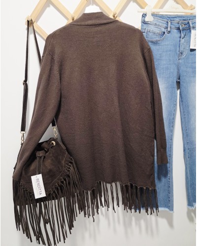 Chaqueta de punto fino en color marrón chocolate. Cuello solapa. Bolsillos plastrón delanteros. Bajo bordeado en finos flecos del mismo color. No se atan.