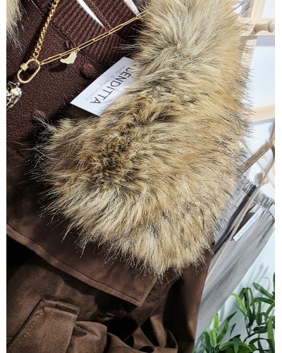 Chaqueta / Cazadora en tejido efecto ante color marrón chocolate. Con gran cuello solapa efecto pelo de gran calidad y abundante que hace efecto envolvente. Manga larga acabada en puño. Cremallera y corchete para su cierre. Bolsillos laterales. Con forro interior.