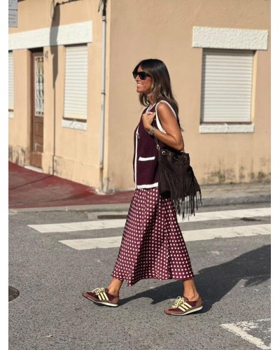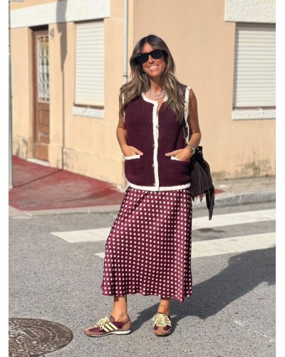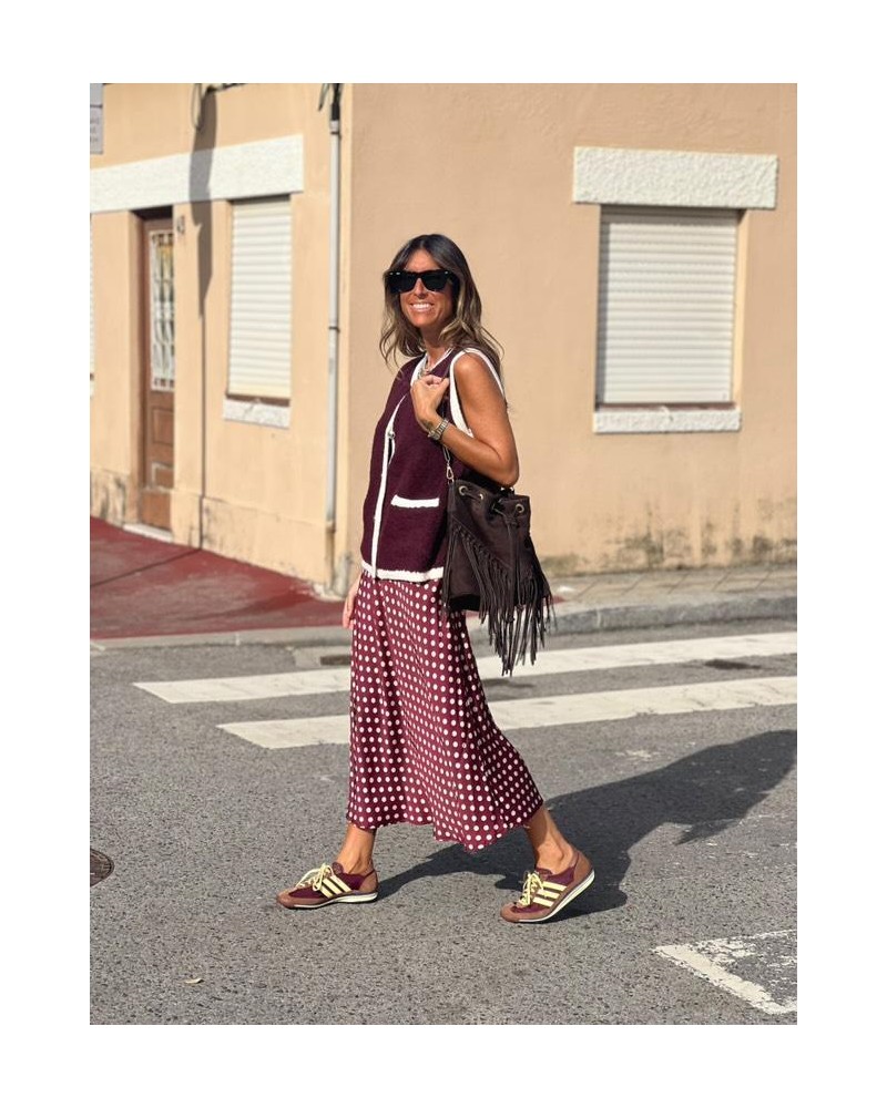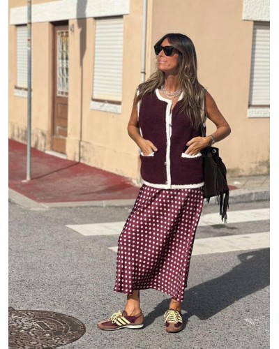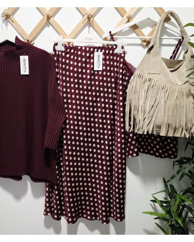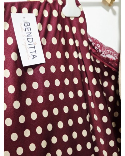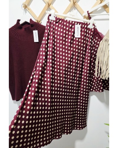 Falda Larga con estampado de lunares en color crudo y fondo en color burdeos.. Satinada, tipo raso. Con goma elástica en la cintura. Disponemos del top a juego.