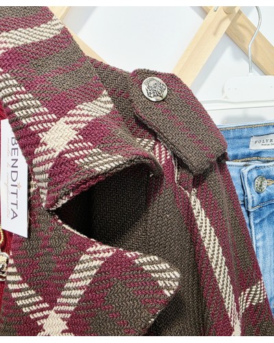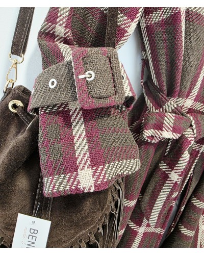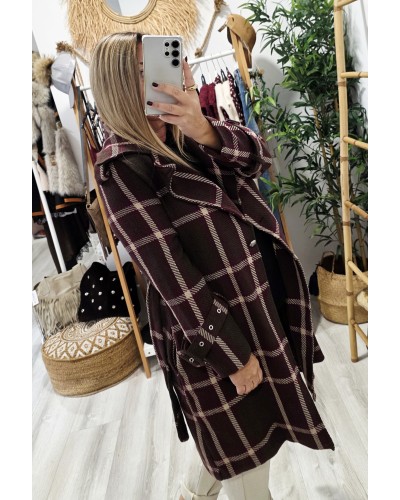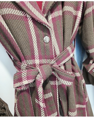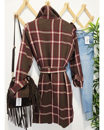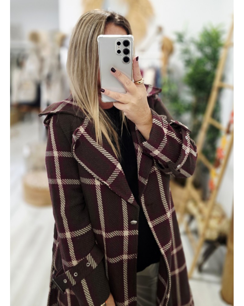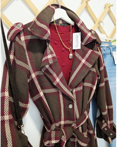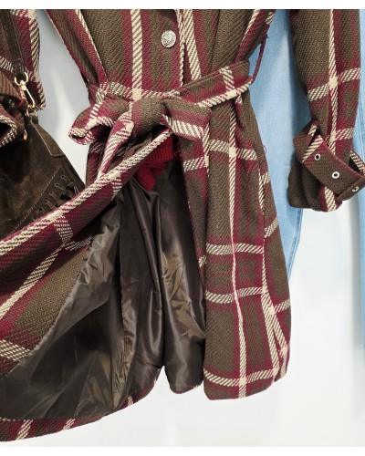 Abrigo de paño grueso con tejido textura en color marrón oscuro. Estampado de gran cuadro en tonos beige y burdeos. Se atan con botón y cinturón. Cuello solapa. Con bolsillos. Forro interior. Detalle de trabillas en puños y botones metálicos en hombros.