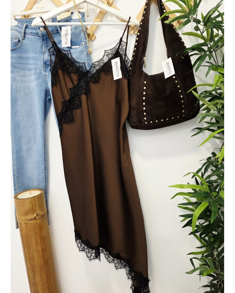 Vestido satinado en color marrón y combinado con encaje en negro. Bajo asimétrico, más larguito por un lateral y con abertura. Tirantes finos regulables. Puntilla negra en escote, espalda y bajo.