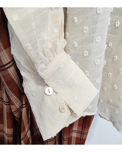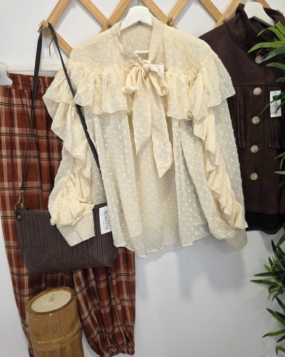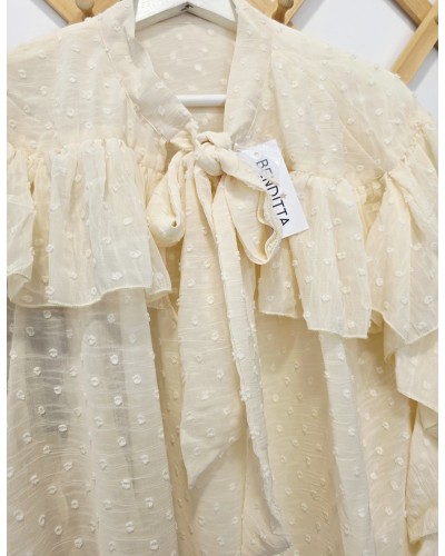 Blusa de tejido plumeti en color marfil. Tejido semitransparente. Con lazada en cuello, volantes en mangas y botones en puños para su cierre. Son anchitas.