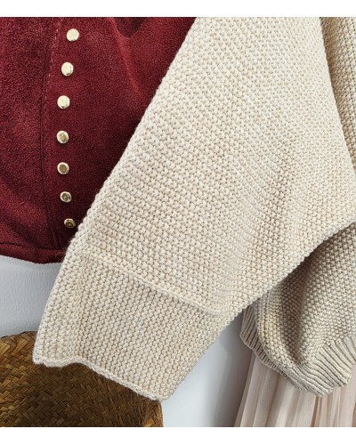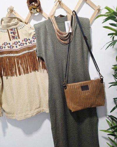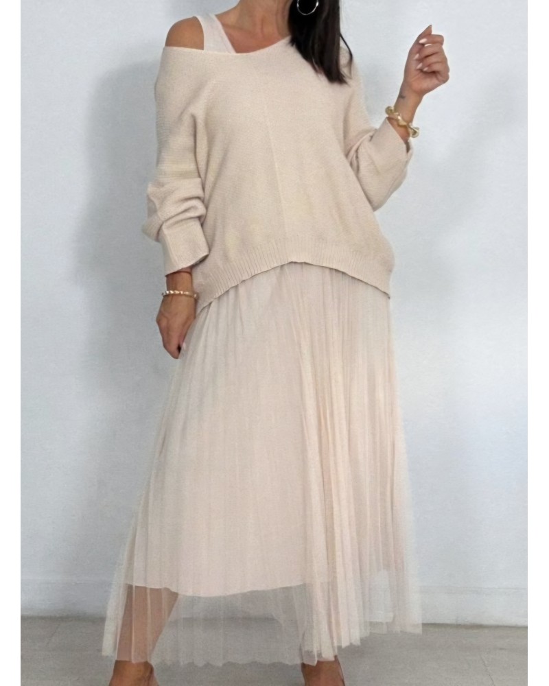 Conjunto de vestido y jersey que se pueden llevar también por separado en tonos tostado. El jersey es de punto arroz con cuello pico y manga 3/4, son anchitos. El vestido tiene la parte superior de tirante anchos de algodón y la parte de la falda es doble capa de algodón y tul plisado encima.