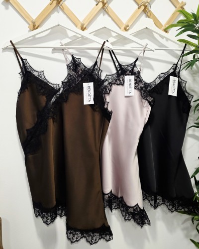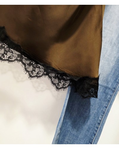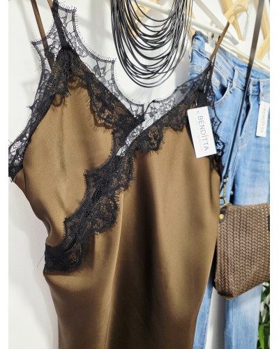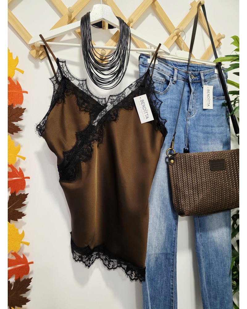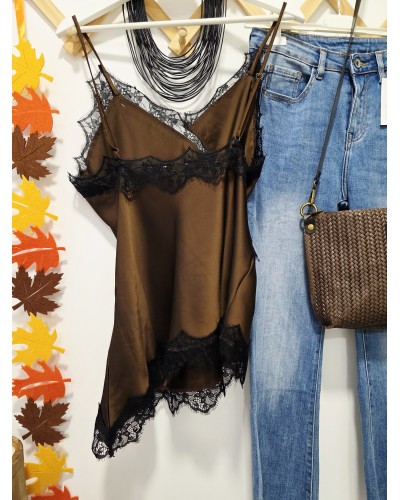 Top satinado en color marrón y combinado con encaje en negro. Bajo asimétrico, más larguito por un lateral. Tirantes finos regulables. Puntilla negra en escote, espalda y bajo.