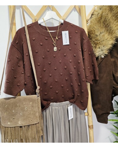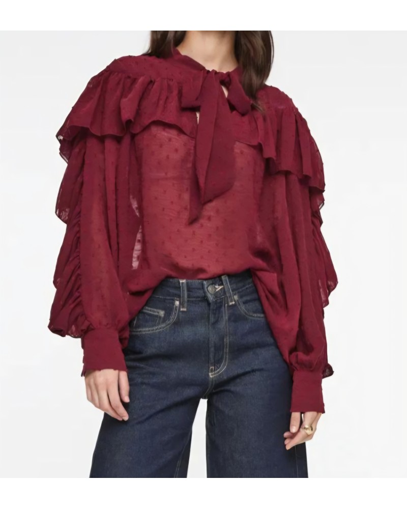 Blusa de tejido plumeti en color borgoña. Tejido semitransparente. Con lazada en cuello, volantes en mangas y botones en puños para su cierre. Son anchitas.