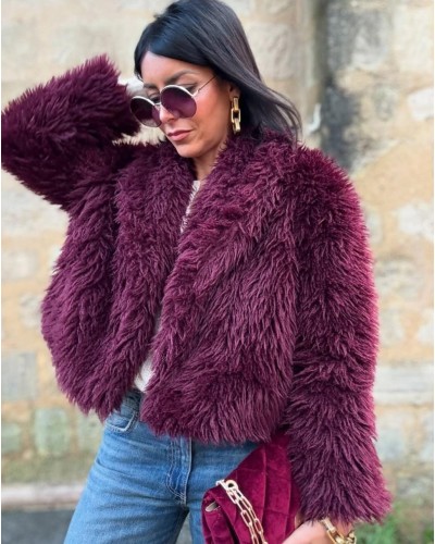 Chaquetón efecto pelo largo en color borgoña. Con capucha amplia, bolsillos laterales y forrados en su interior. Pelo abundante y gustoso. El modelo de este año lleva capucha y más larguito que el del año pasado ( imagen de la modelo).
