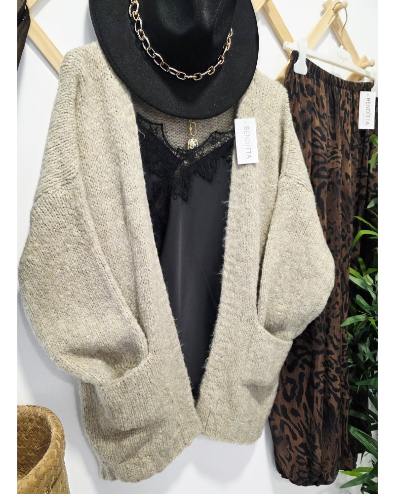 Chaqueta larguita de lana en color tostado. Con bolsillos delanteros plastrón. No se atan.