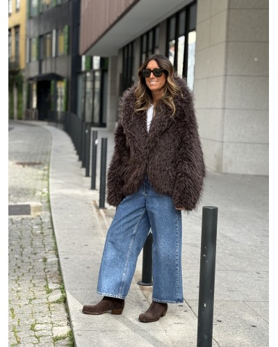 Chaquetón efecto pelo largo en color marrón chocolate. Con capucha amplia, bolsillos laterales y forrados en su interior. Pelo abundante y gustoso. Más larguitos por detrás.