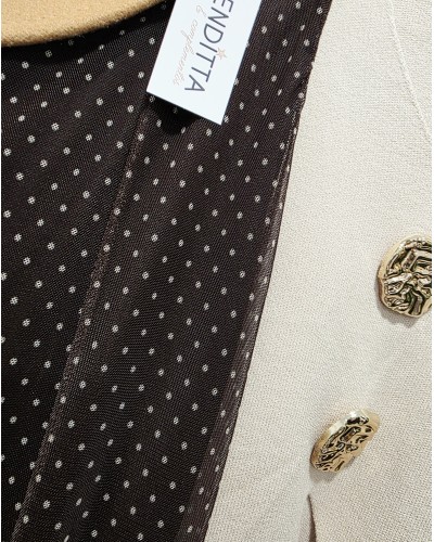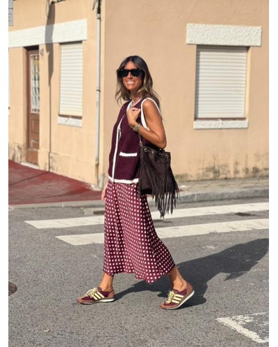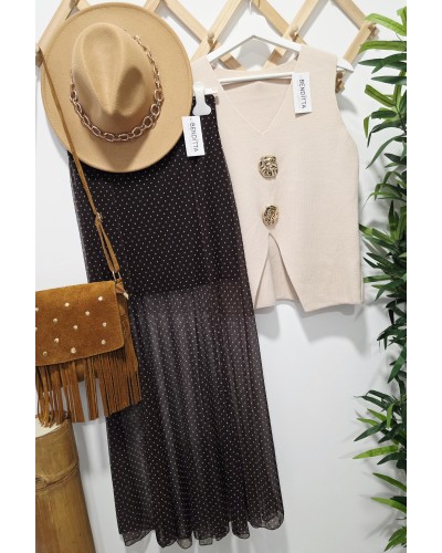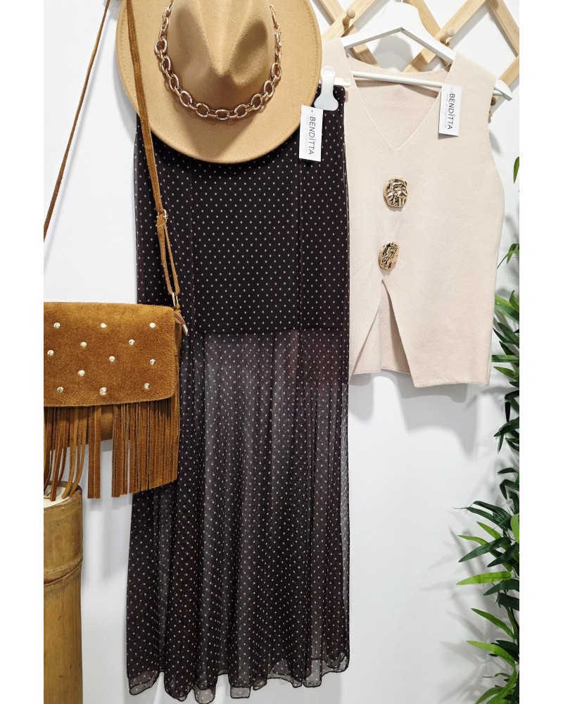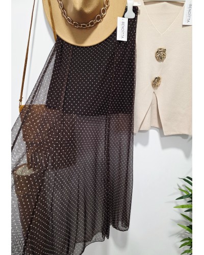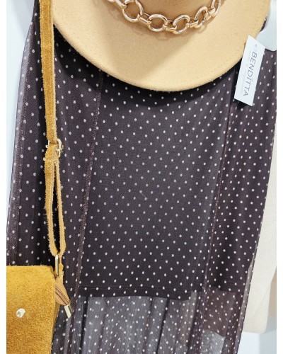 Falda larga de gasa en color marrón chocolate con pequeños lunares en tostado. Lleva incluida falda corta en marrón. Con goma elástica en cintura. Son elásticas.