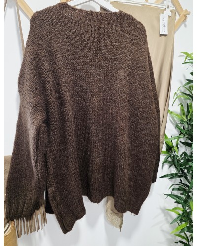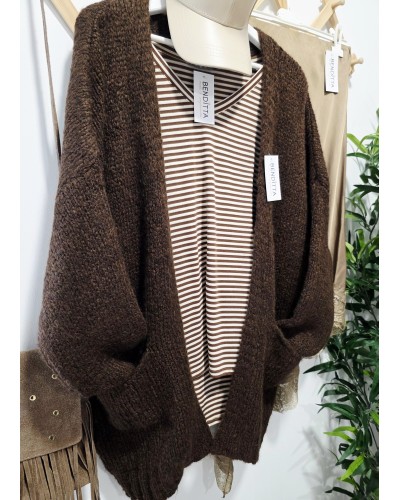 Chaqueta larguita de lana en color marrón oscuro jaspeado. Con bolsillos delanteros plastrón. No se atan.