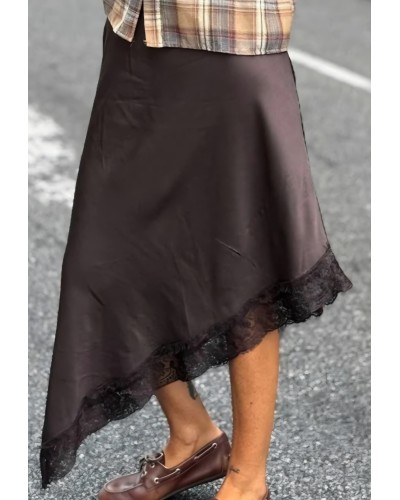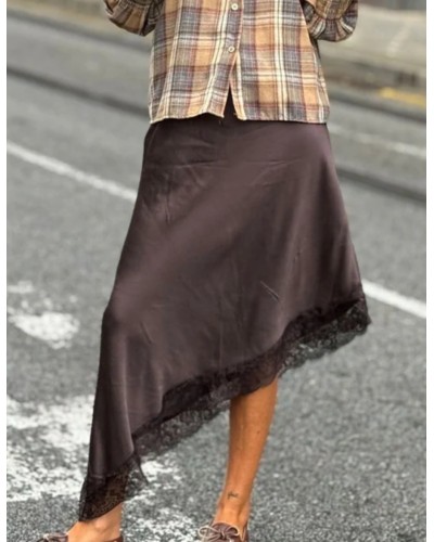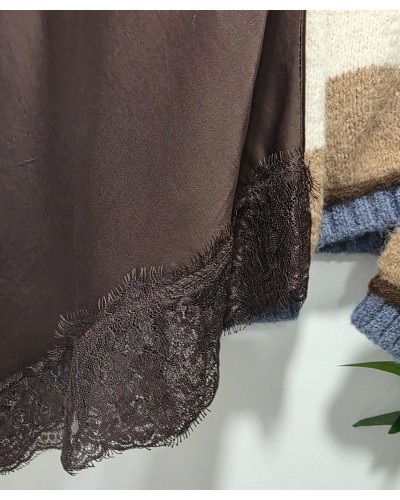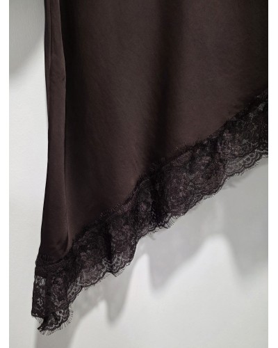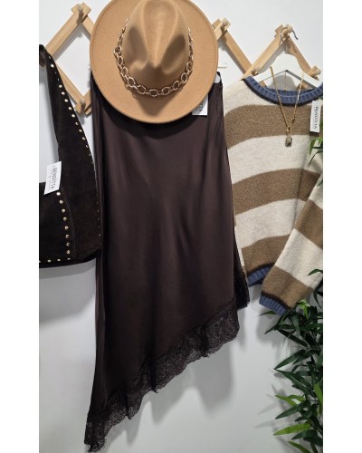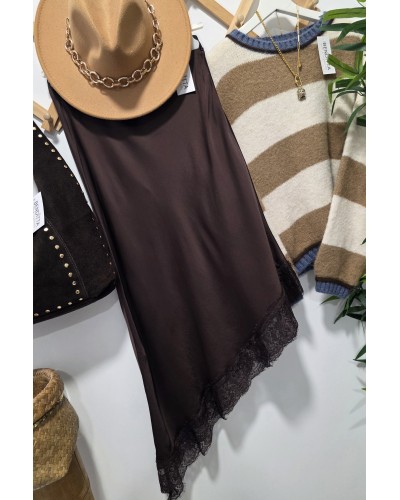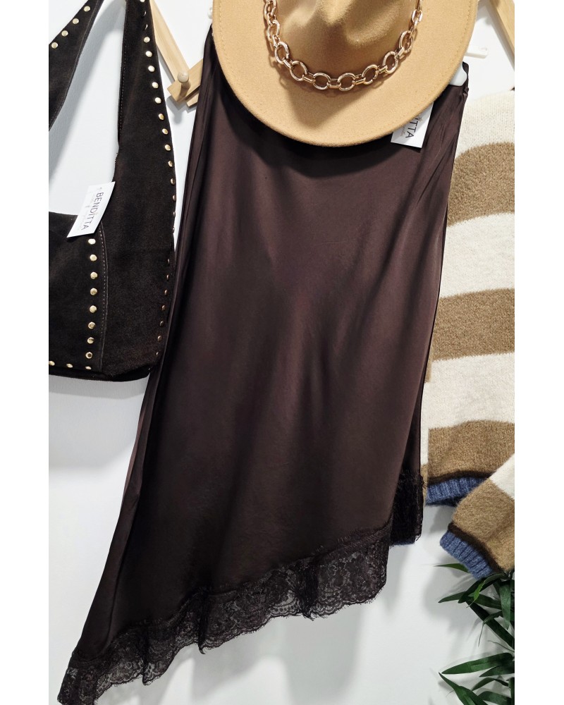 Falda satinada en color marrón chocolate con bajo asimétrico y bordeado en puntilla del mismo color. Goma elástica en cintura.