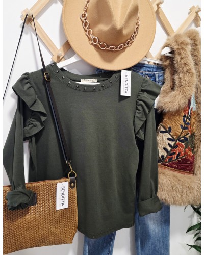 Camiseta de algodón en color verde oscuro. Con manga larga y cuello redondo bordeado con tachas en plata y forma de estrellas. Llevan volante del mismo color en hombros.