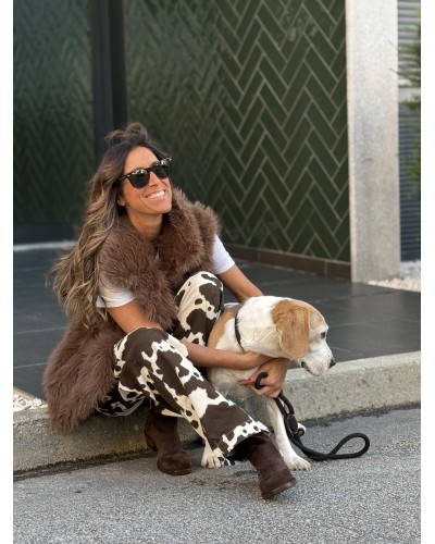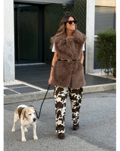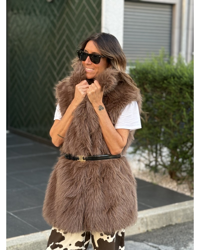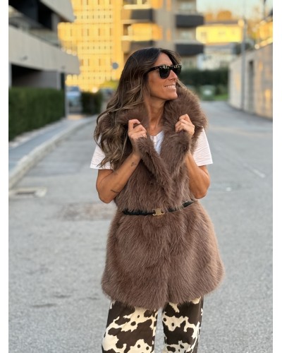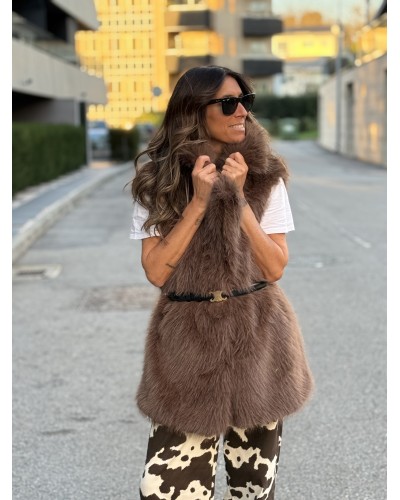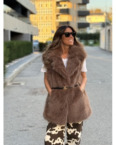 Chaleco efecto pelo, abundante en color marrón. Largo 3/4. Con cuello solapa, bolsillos y clips delanteros para su cierre. Con forro.