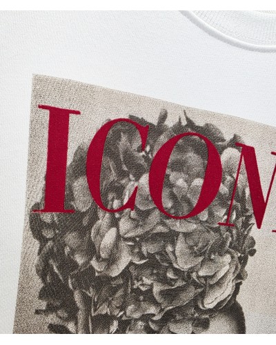 Sudadera en color blanco con estampado frontal en tonos tostados y texto en rojo terciopelo. Cuello redondo. Manga larga.