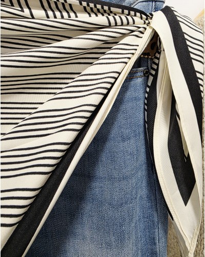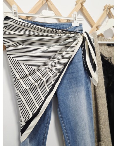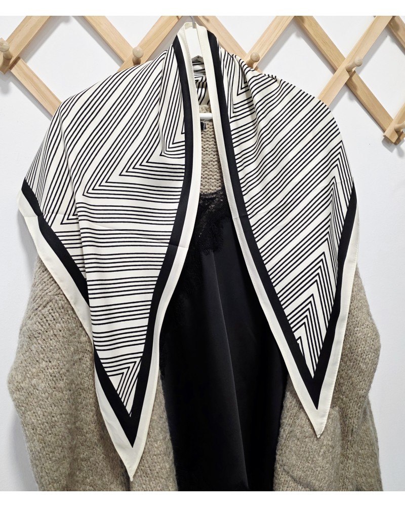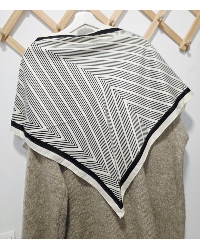 Pañuelo en forma de pico con estampado mil rayas en negro y fondo en beige. El complemento perfecto para llevar en la cadera, hombros, bolso, al cuello...