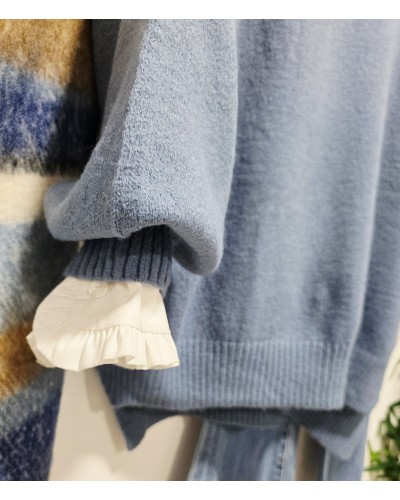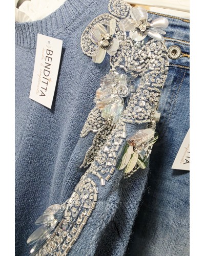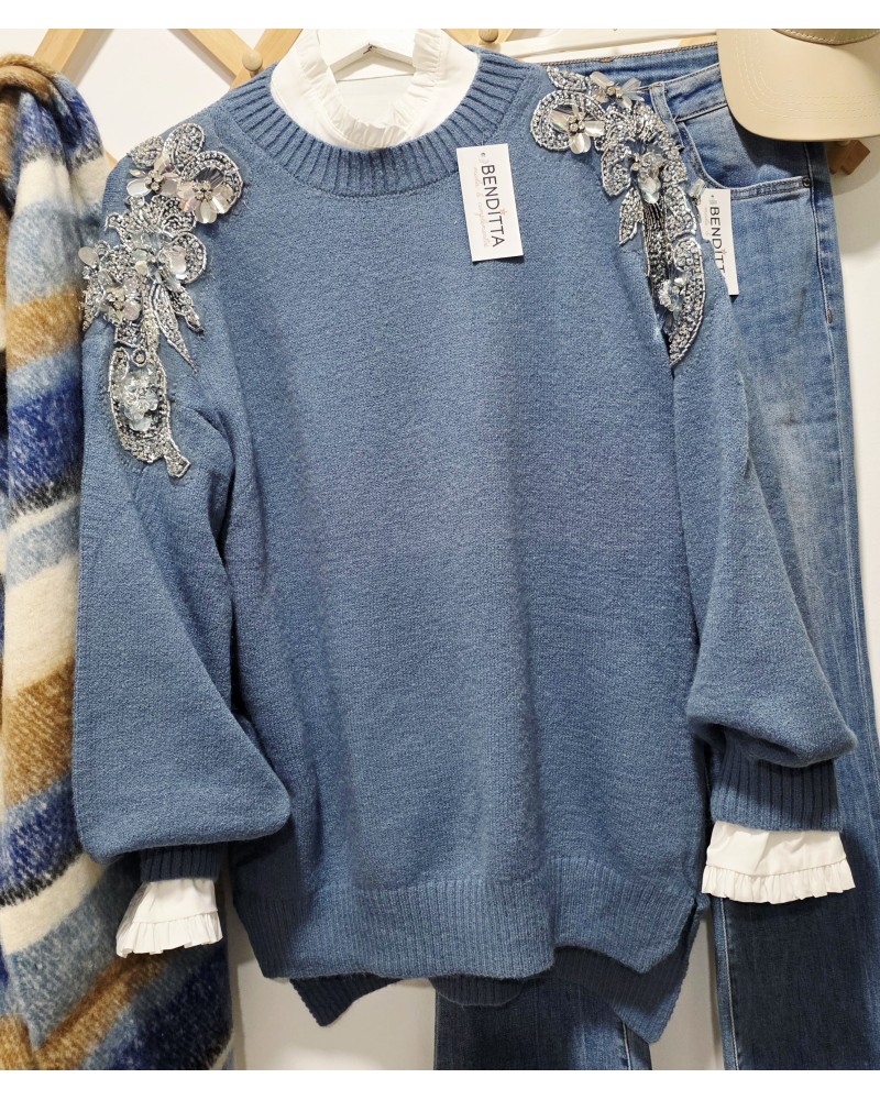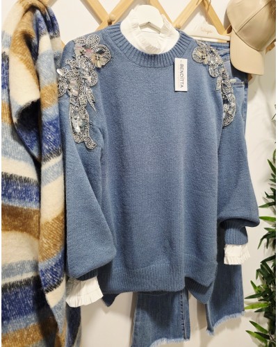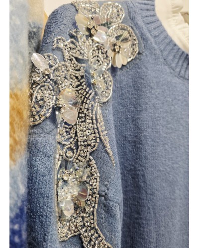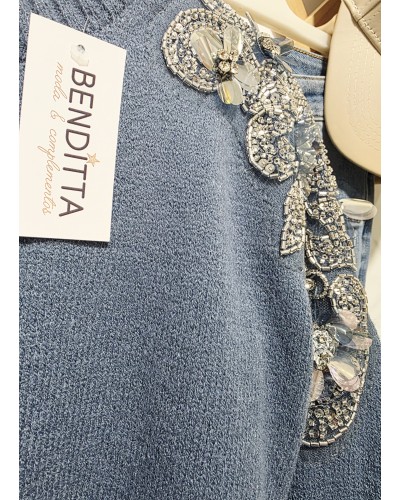 Jersey de punto suave y gustoso en color azul. Cuello redondo. Larguitos. Detalle en hombros de abalorios y pedrería en color plata y transparente.