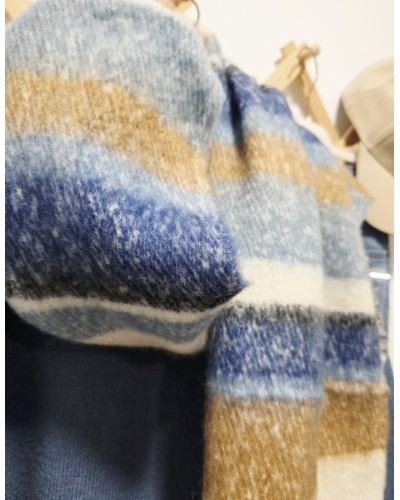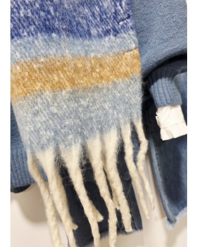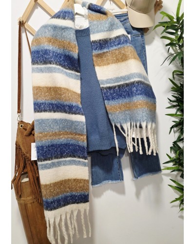 Bufanda XL acabada en flecos gruesos con estampado de rayas y tonos azules, crudo, camel...Muy gustosa y calentita.