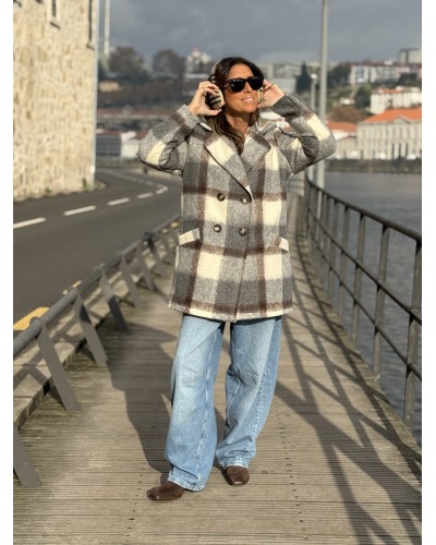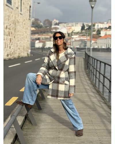 Chaquetón muy suave y gustoso con estampado de cuadros en tonos grises y marrón y fondo en color hueso. Con doble botonadura y bolsillos delanteros. Cuello solapa.