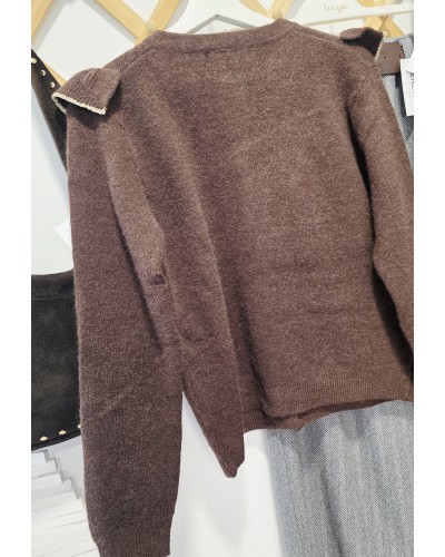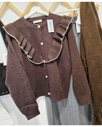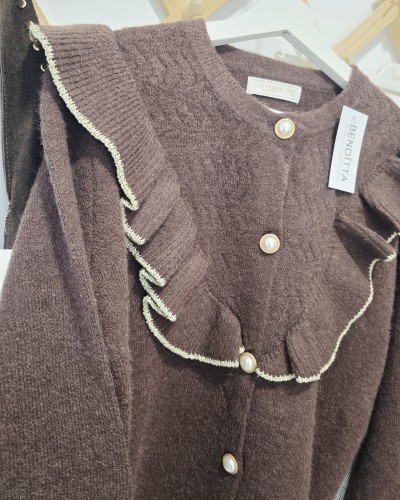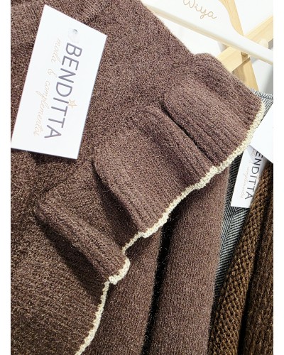 Chaqueta de punto en color marrón chocolate abotonada en parte delantera. Con detalle de volante en parte frontal ribeteado en punto dorado. Calentitas y suaves.