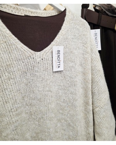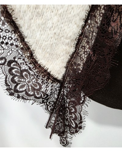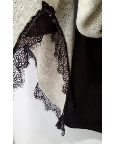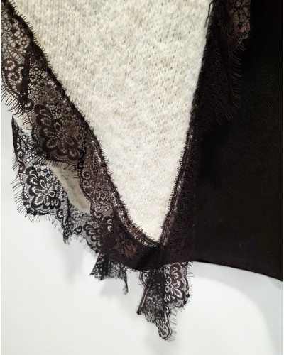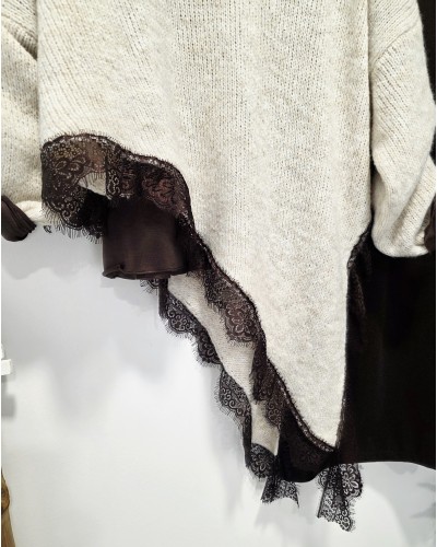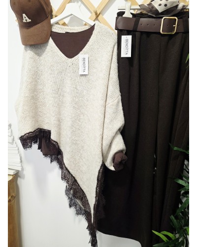 Jersey de punto en color tostado. Cuello pico y manga larga. Bajo asimétrico bordeado con puntilla en color chocolate. Más largo por un lateral acabado en pico.