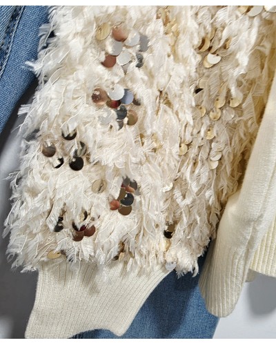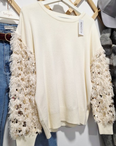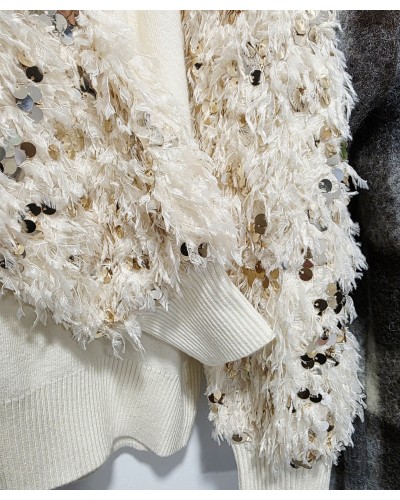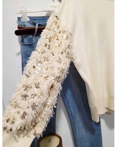 Jersey de punto fino en color hueso. Con mangas de flecos del mismo tono y alguna lentejuela en dorado. Cuello redondo.